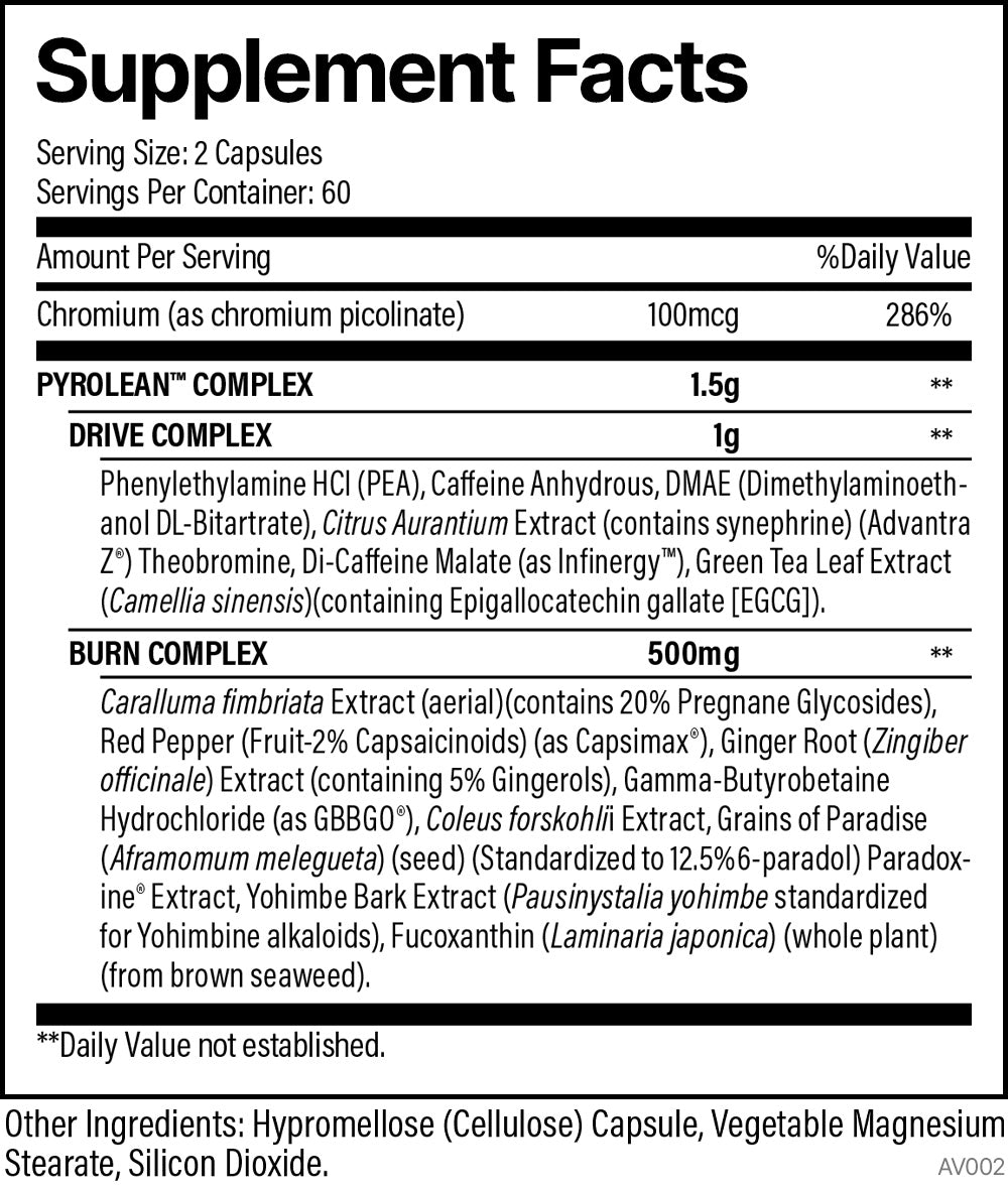 At the heart of PYROLEAN is the Drive Complex, a powerful 350mg blend of Caffeine Anhydrous and Di-Caffeine Malate (as Infinergy™). This energy powerhouse delivers an immediate burst of alertness followed by a smooth, sustained lift that keeps you going without the crash. To elevate mood, focus, and mental drive, the complex also includes Phenylethylamine HCl (PEA) and DMAE. Citrus Aurantium Extract (Advantra Z®) is also added to help support energy and thermogenic activity, while Theobromine and Green Tea Leaf Extract add additional smooth energy and metabolic support. Together, this blend is crafted to help you feel sharp, energized, and motivated from start to finish.